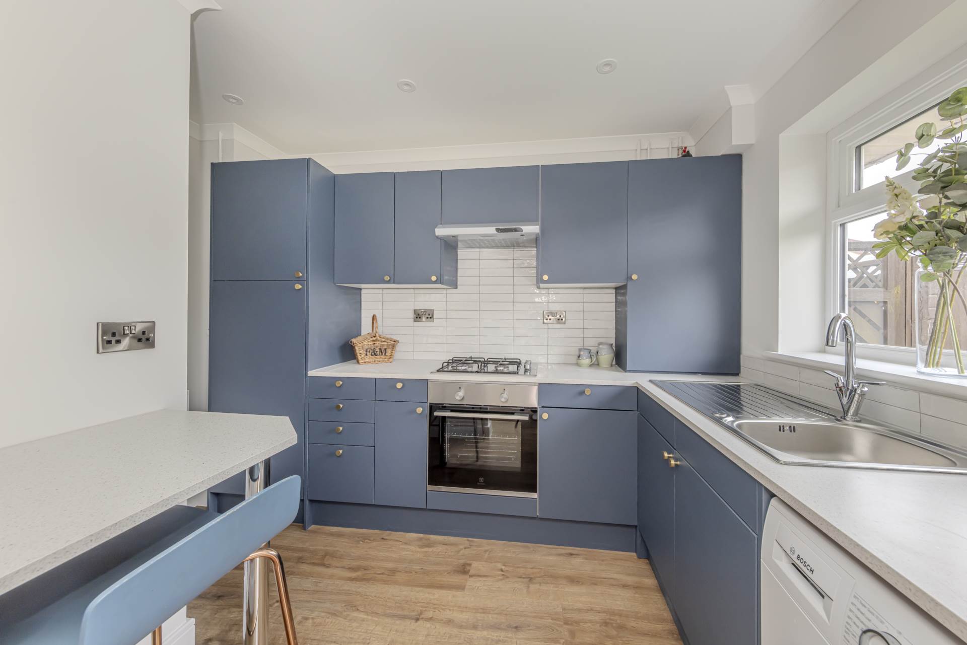 The kitchen is well-appointed and functional, providing sufficient space for cooking and storage. It is fitted with essential appliances and offers a pleasant view of the rear garden, making meal preparation an enjoyable experience.