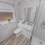 The bathroom is modern and clean, comprising a bath with an overhead shower, a wash basin, and a WC. It has been maintained to a high standard and includes practical tiling and fixtures.