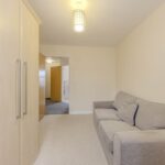 Upon entering, you are welcomed into a bright and airy reception room, perfect for relaxing or entertaining guests. The room benefits from a Juliet balcony, allowing natural light to flood in and providing a pleasant view of the surrounding area. The space is versatile, offering ample room for both seating and dining arrangements.