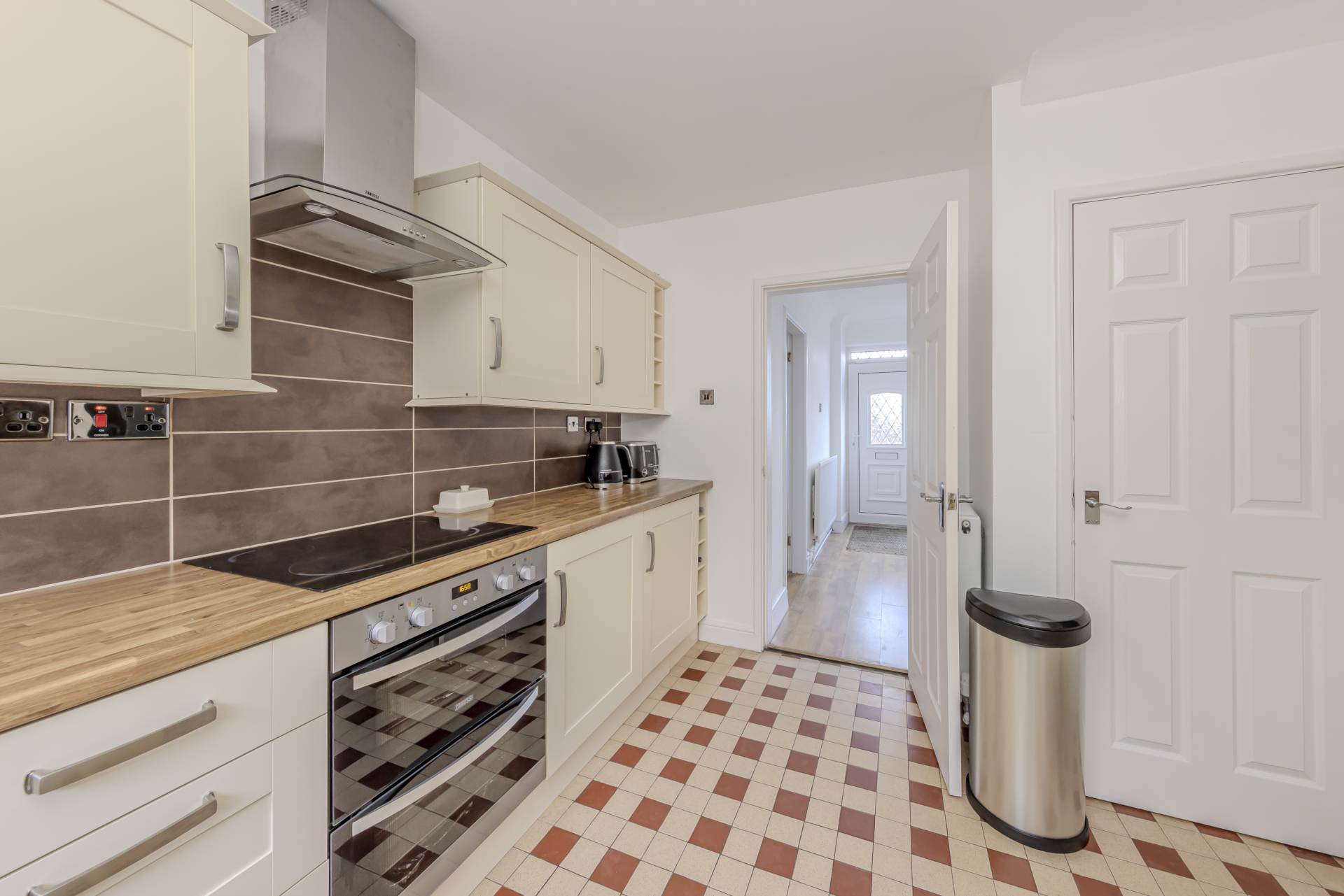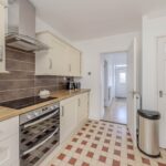 Adjacent to the reception room is the kitchen, equipped with ample work surfaces and storage units, designed to meet the needs of everyday cooking and meal preparation. There is plenty of room for essential appliances, and the layout encourages a practical flow between cooking and dining areas.
