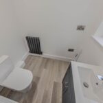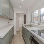 The kitchen is fitted with a range of units and work surfaces, providing plenty of storage and preparation space. Adjacent to the kitchen is a convenient downstairs WC, a practical addition for busy households and visitors alike. From the kitchen, a door leads out to the rear courtyard, a private outdoor space ideal for enjoying a morning coffee or evening unwind. The courtyard is low maintenance, offering a secure and cosy area for outdoor seating or potted plants.