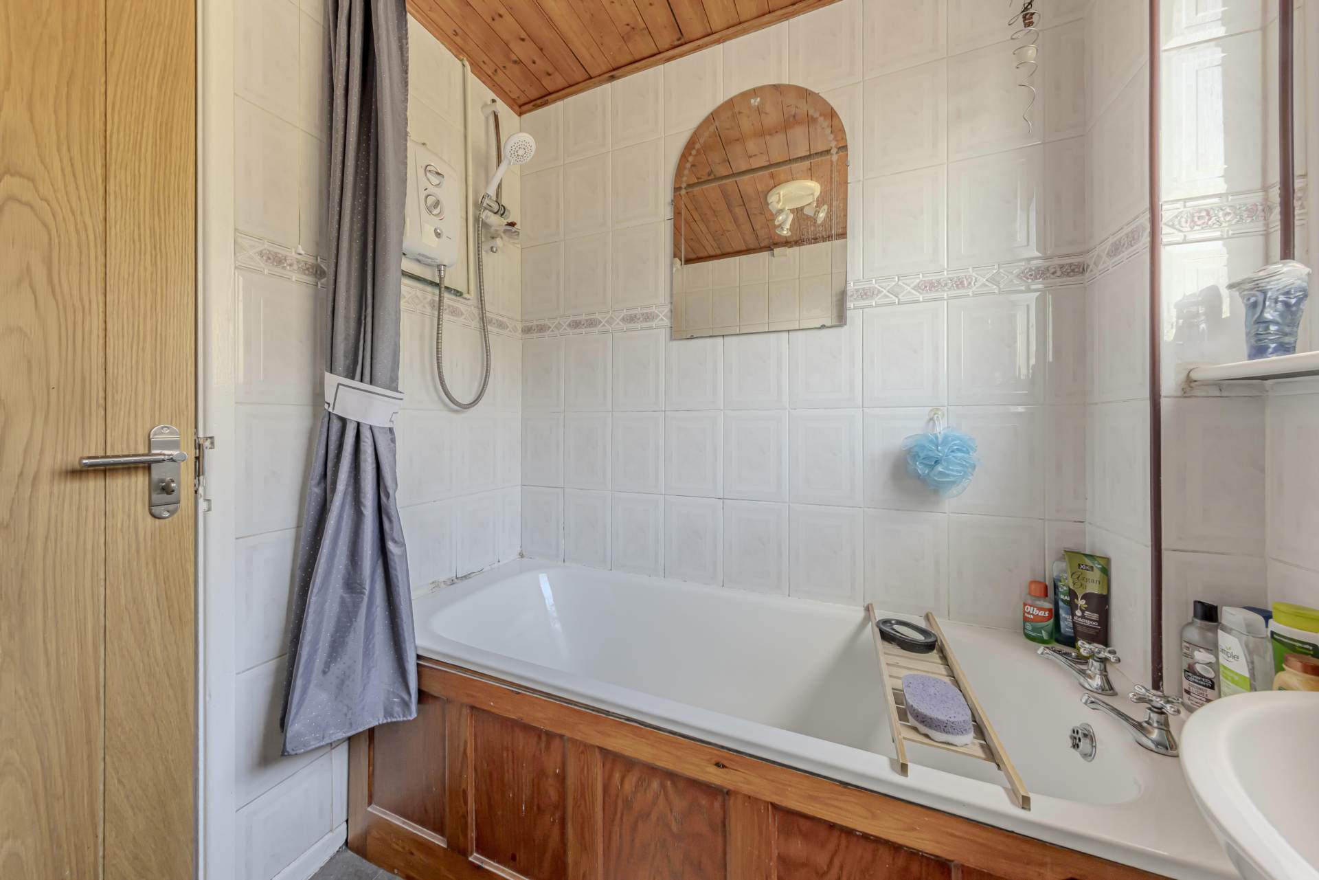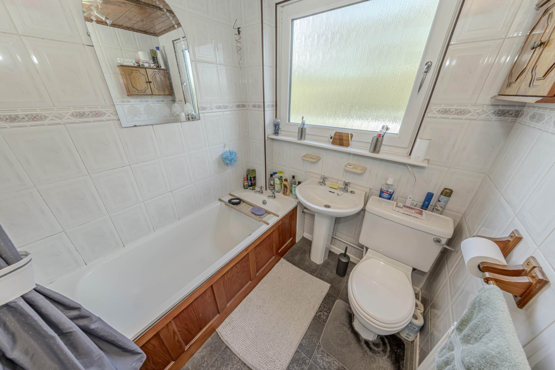 Upstairs, the property comprises three well-proportioned bedrooms, each benefiting from double glazing and gas central heating, ensuring comfort throughout the year. The bathroom is modern and well-appointed, featuring a bath with shower over, a wash basin, and WC, finished in neutral tones to suit a variety of tastes.