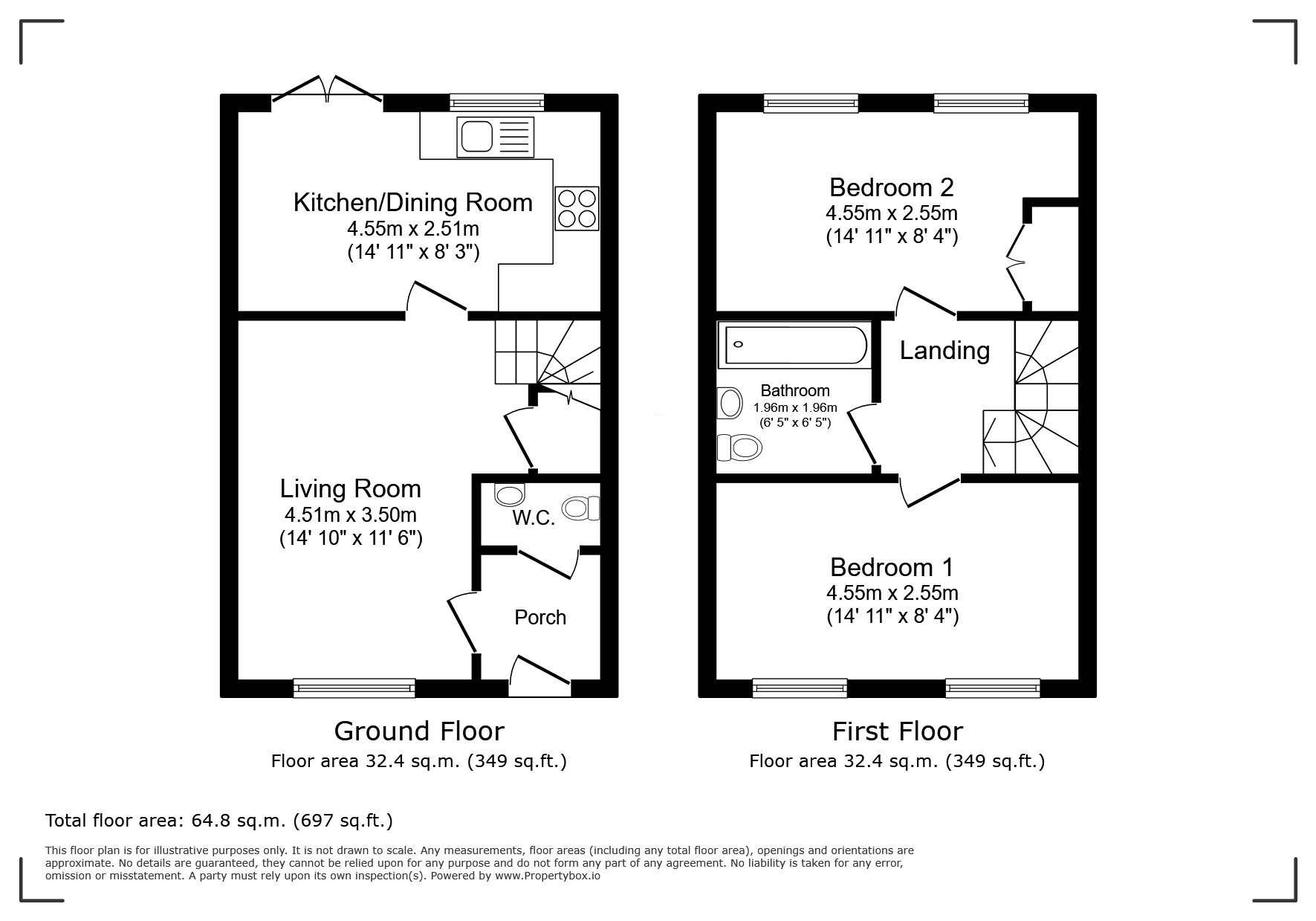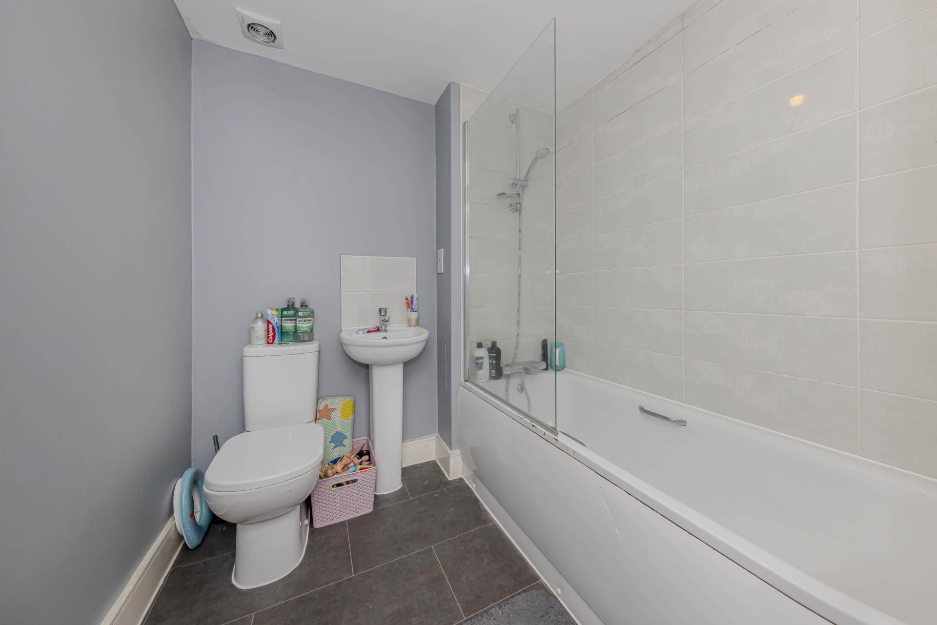 Upstairs, the property comprises two well-proportioned bedrooms, each offering plenty of space for rest and relaxation. Both rooms benefit from good natural light and neutral tones, allowing new owners to personalise the space with ease. The bathroom is tastefully finished with modern sanitary ware, including a bath with an overhead shower, a wash basin, and a WC, all presented to a high standard.