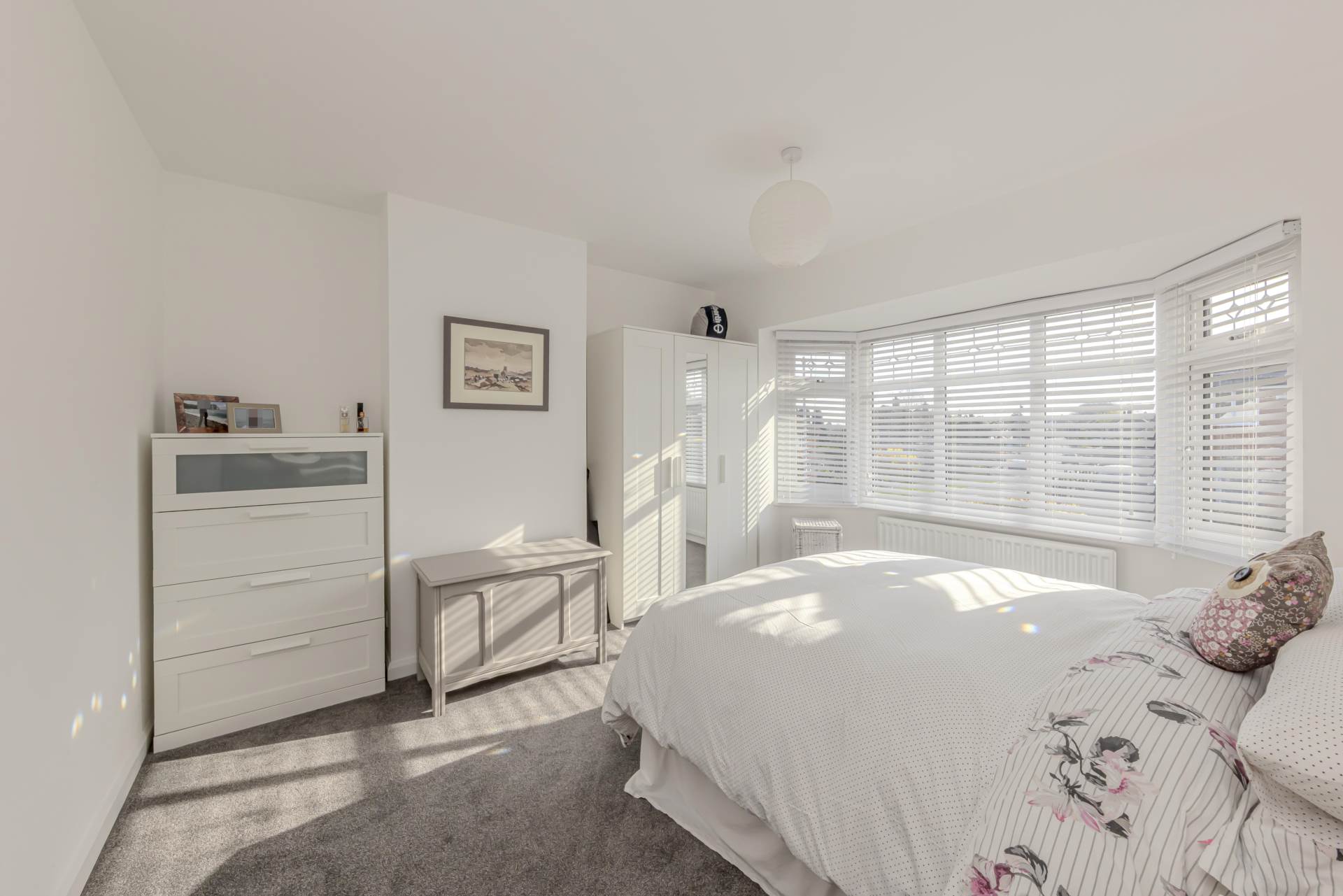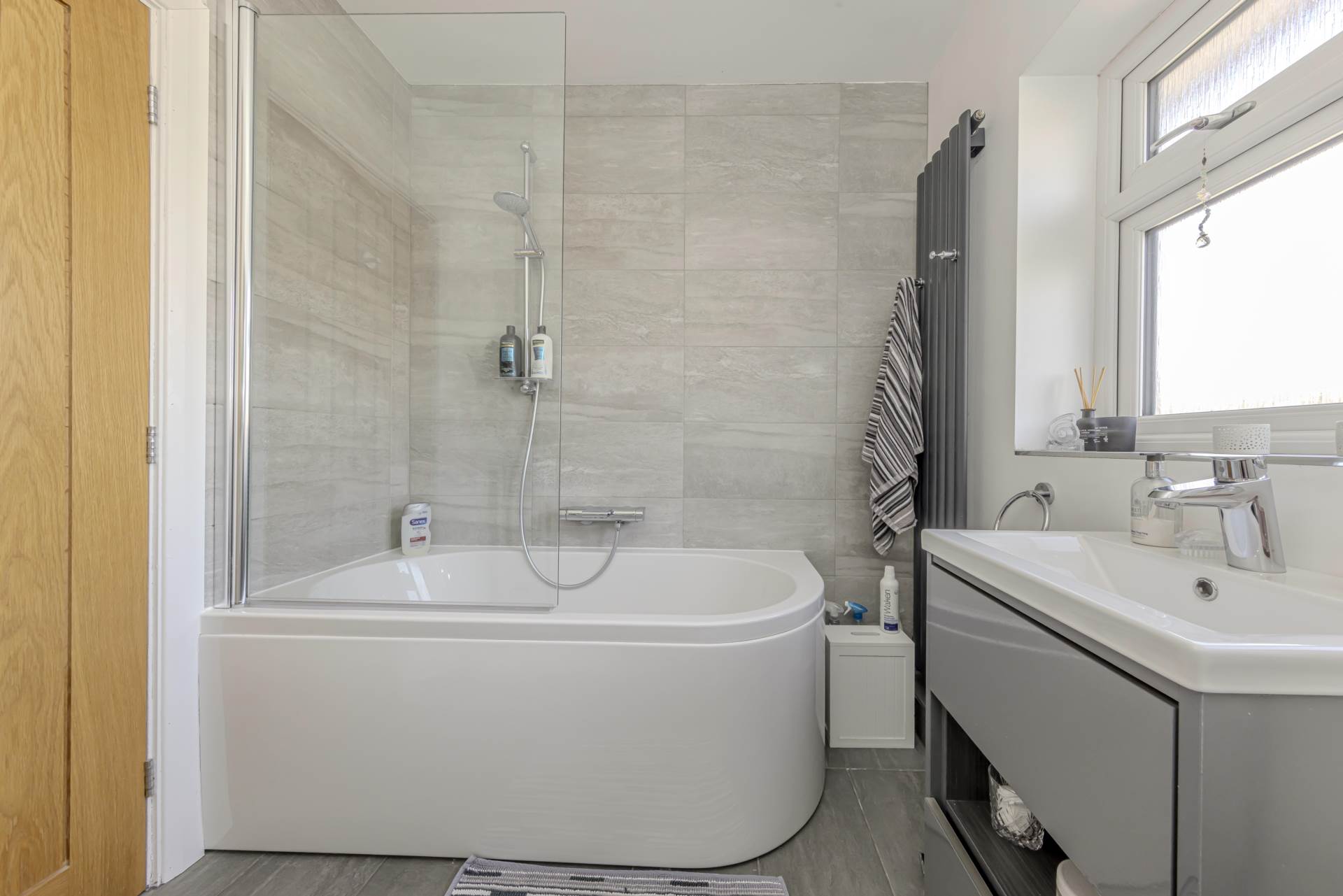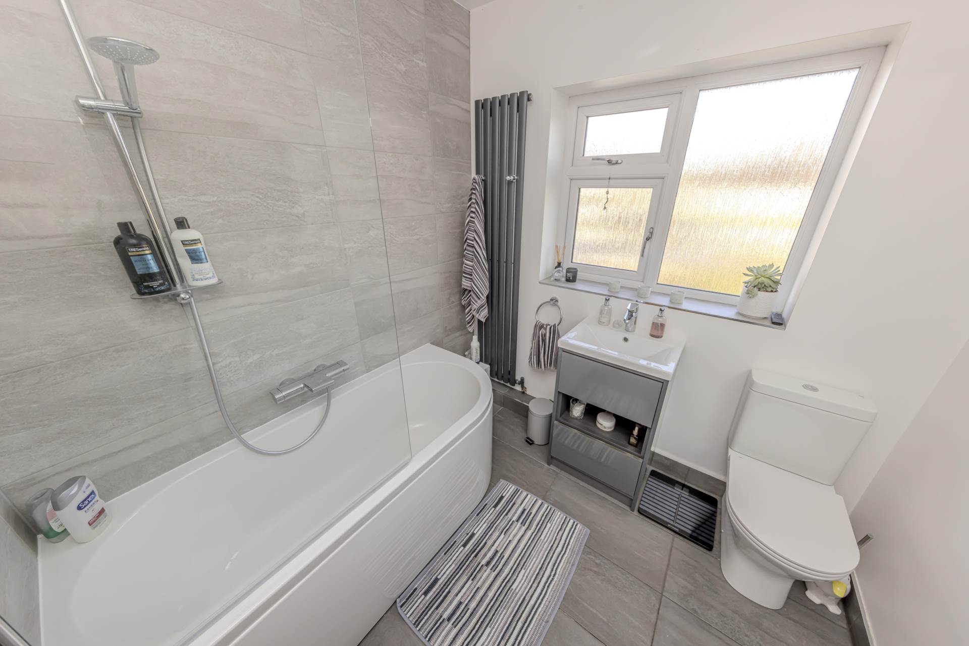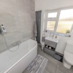 Upstairs, the property boasts three well-proportioned bedrooms, each benefiting from the same double glazing and neutral décor, creating a calm and restful atmosphere. The family bathroom has also been modernised, featuring contemporary fittings, a clean white suite, and a shower over the bath, catering perfectly to the needs of a busy household.