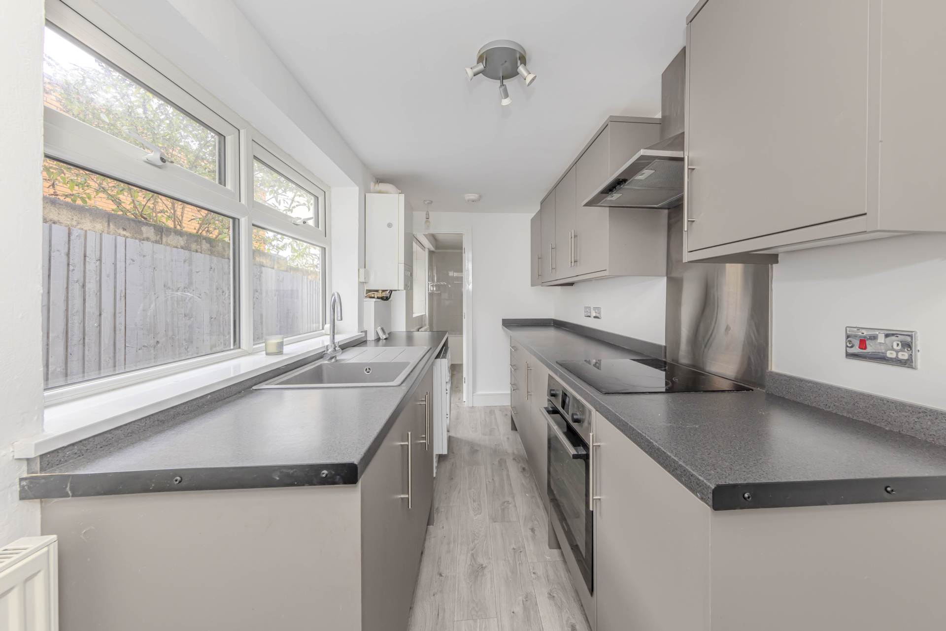 The galley kitchen is practical and efficient, fitted with a range of units and work surfaces, providing plenty of storage and preparation space. It benefits from natural light and offers direct access to the rear yard, ideal for outdoor seating or gardening. Upstairs, you will find two well-proportioned bedrooms, both featuring double glazing that ensures a peaceful environment and excellent insulation. The bathroom is neatly presented and includes a modern suite with a bath and overhead shower, complemented by contemporary tiling.