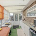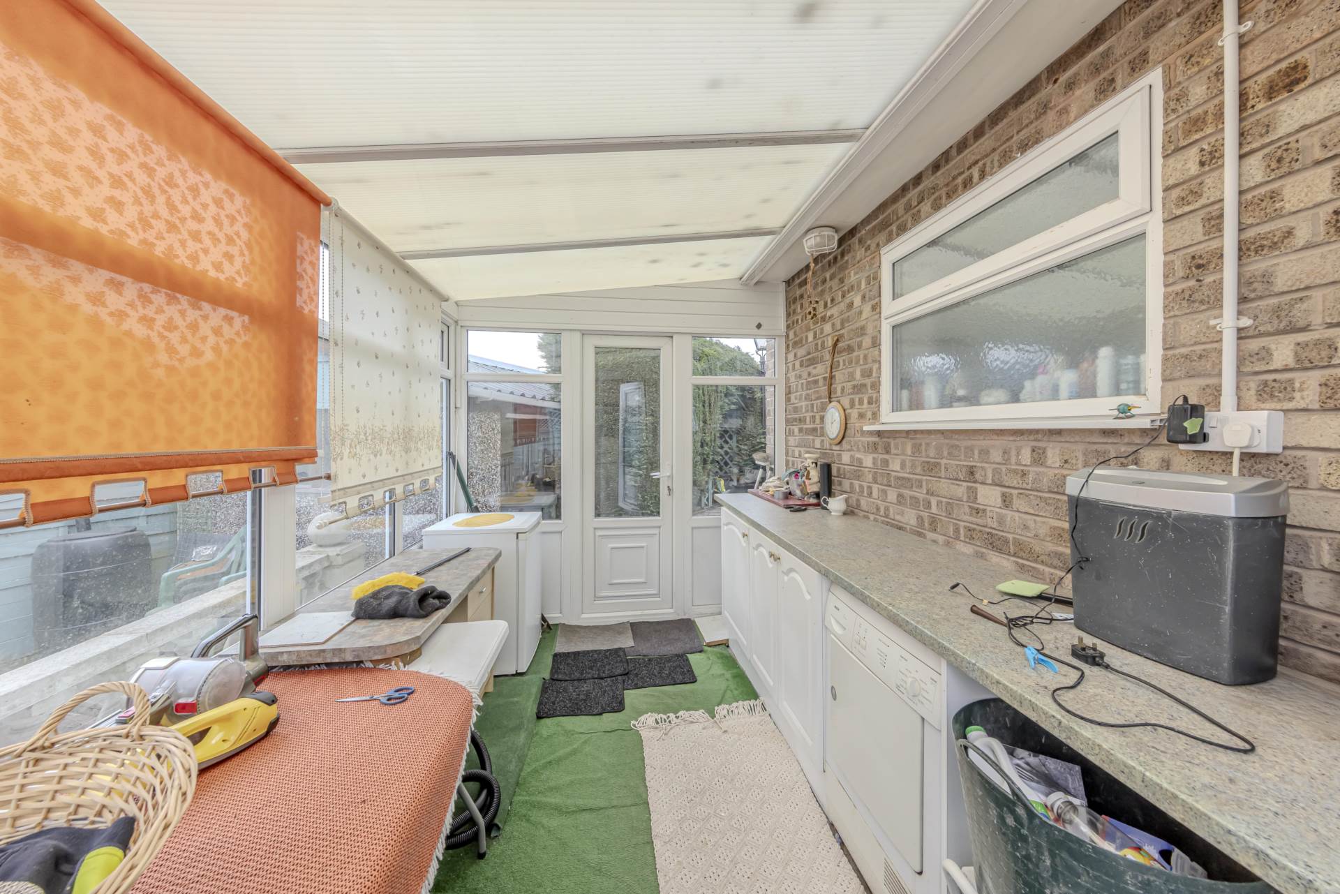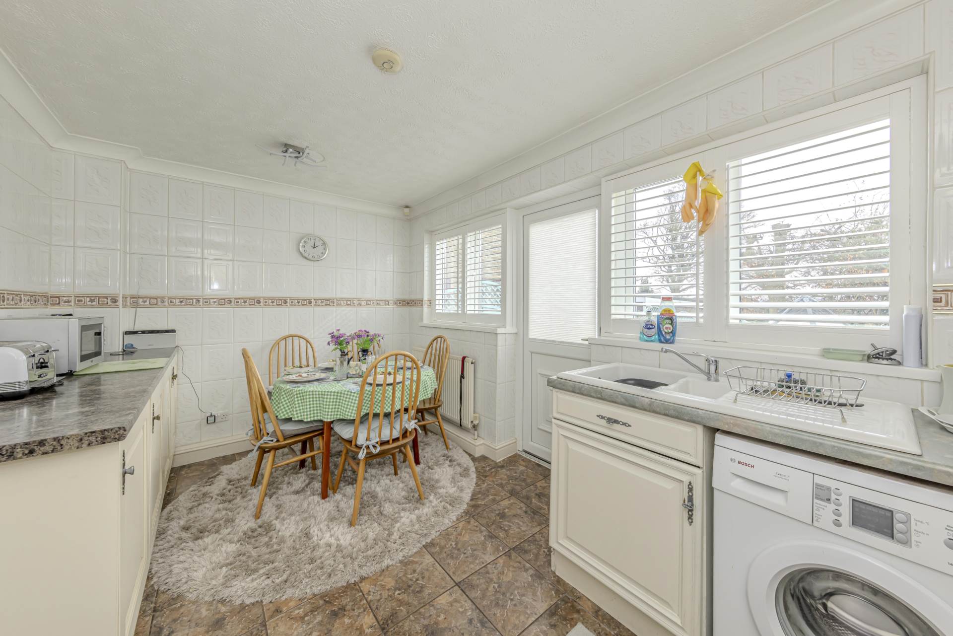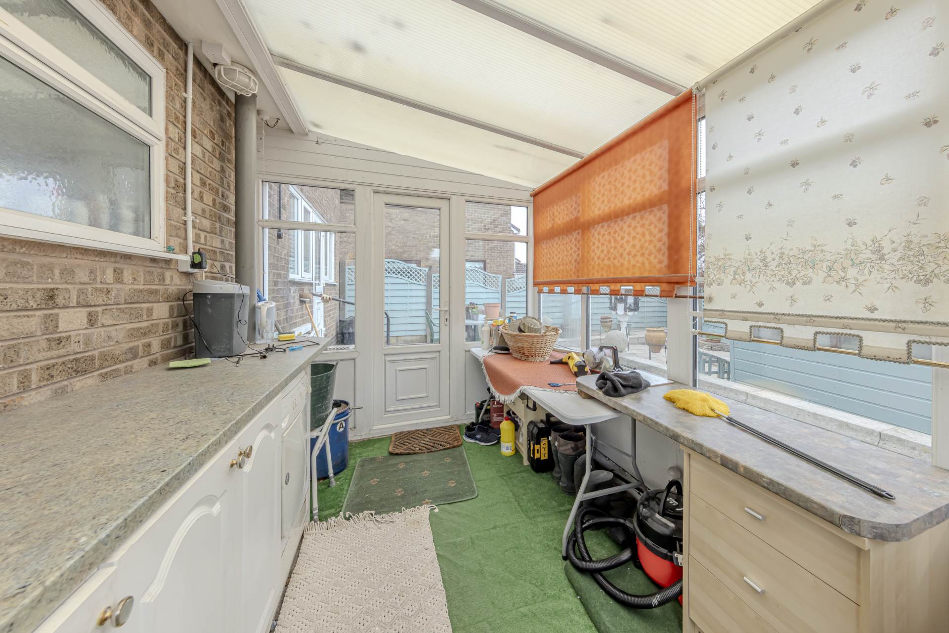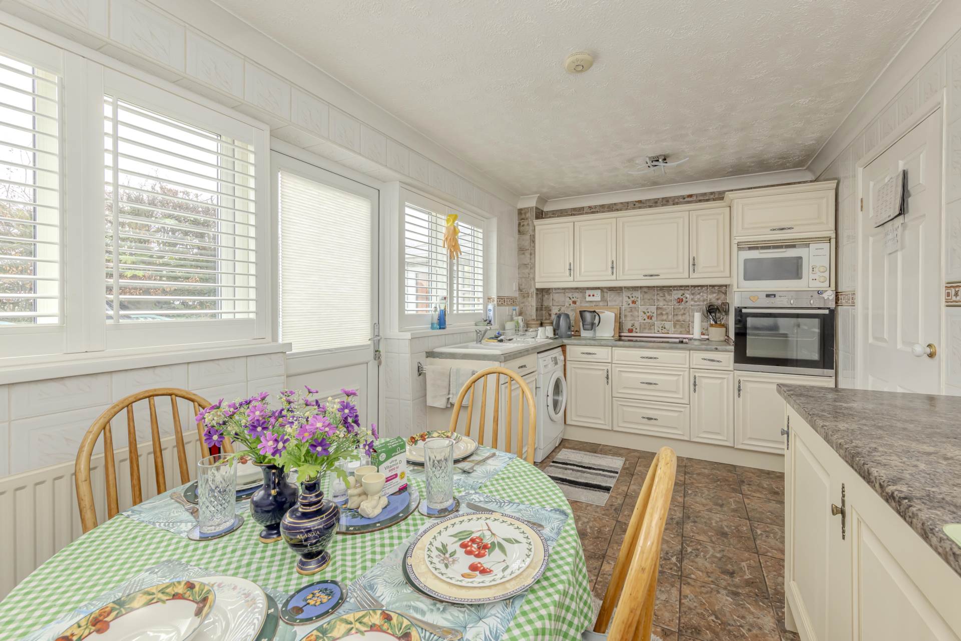 The kitchen is well-appointed with a range of fitted units and work surfaces, along with space for essential appliances. Adjacent to the kitchen is a charming conservatory, providing a bright and airy space with pleasant views over the garden ideal for year-round enjoyment.
