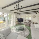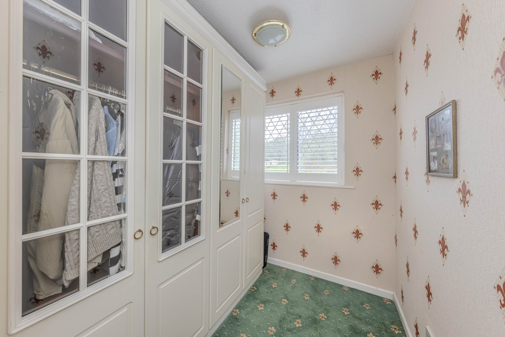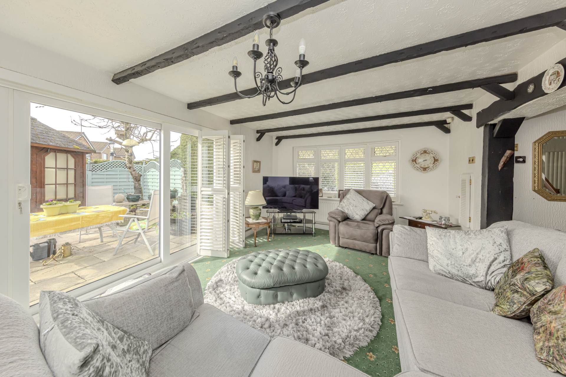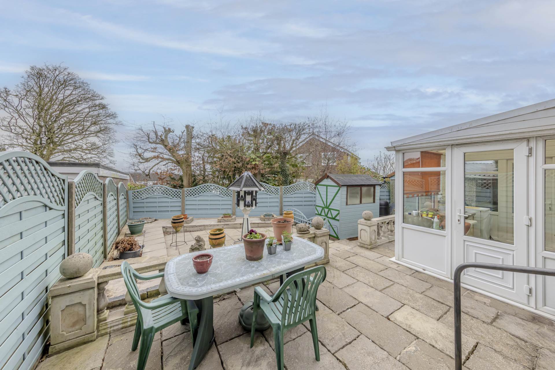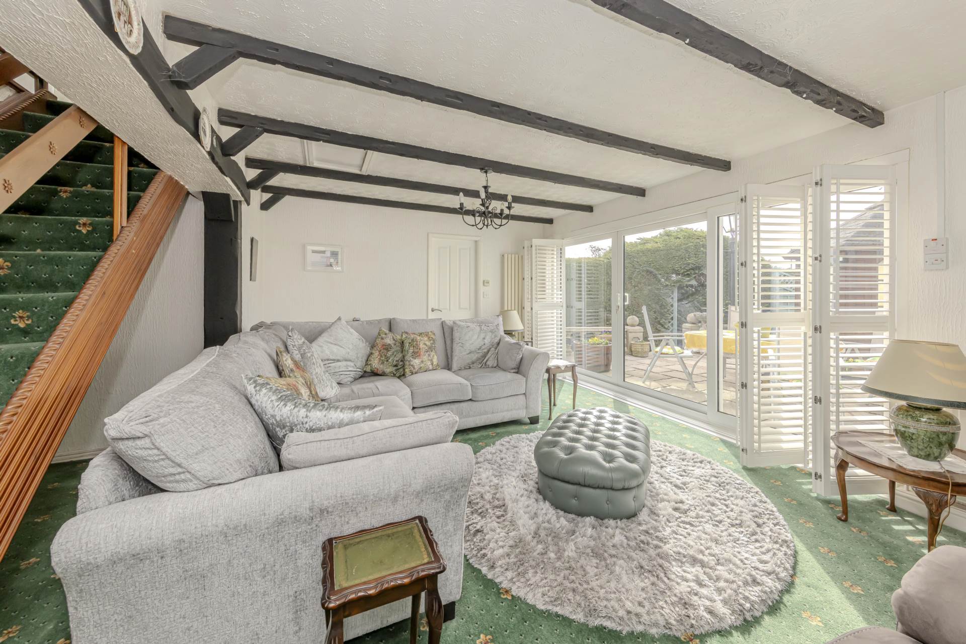 The kitchen is well-appointed with a range of fitted units and work surfaces, along with space for essential appliances. Adjacent to the kitchen is a charming conservatory, providing a bright and airy space with pleasant views over the garden ideal for year-round enjoyment.