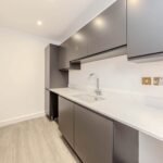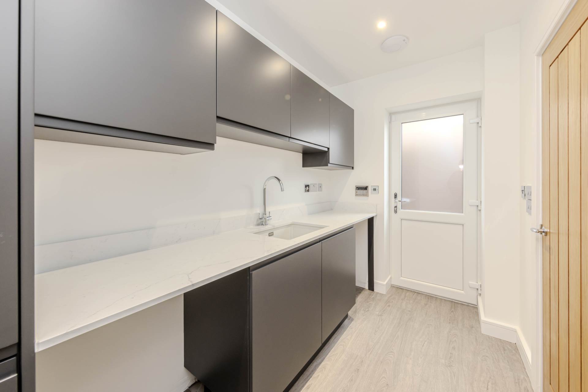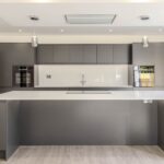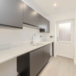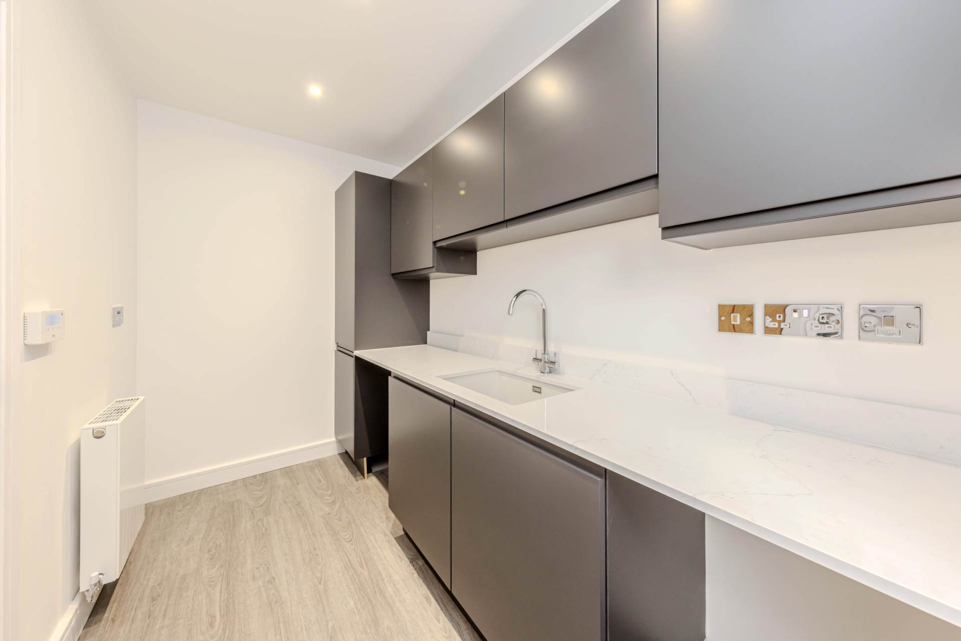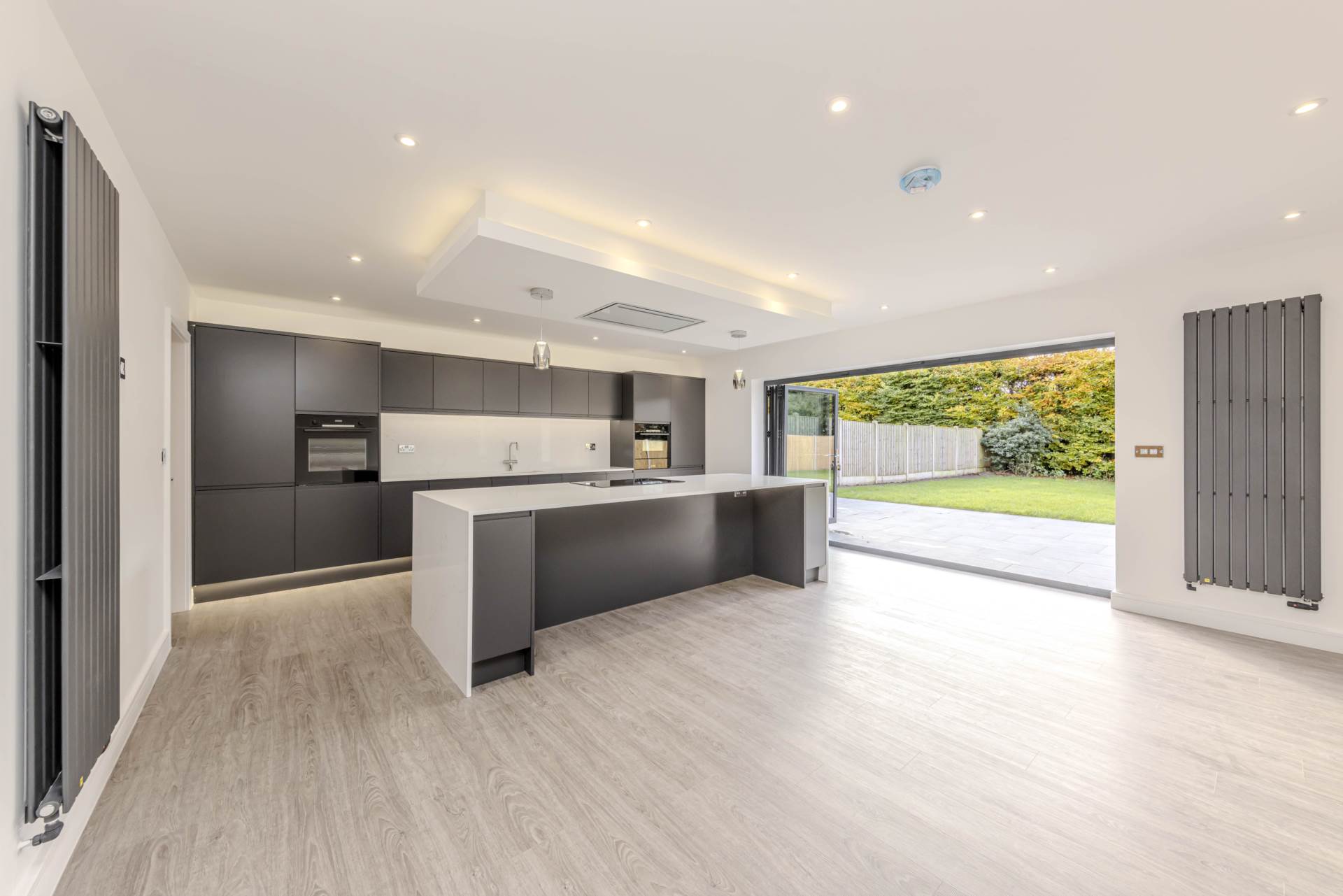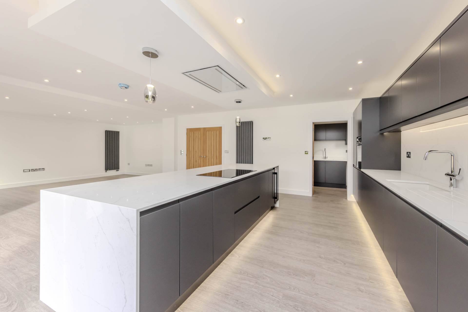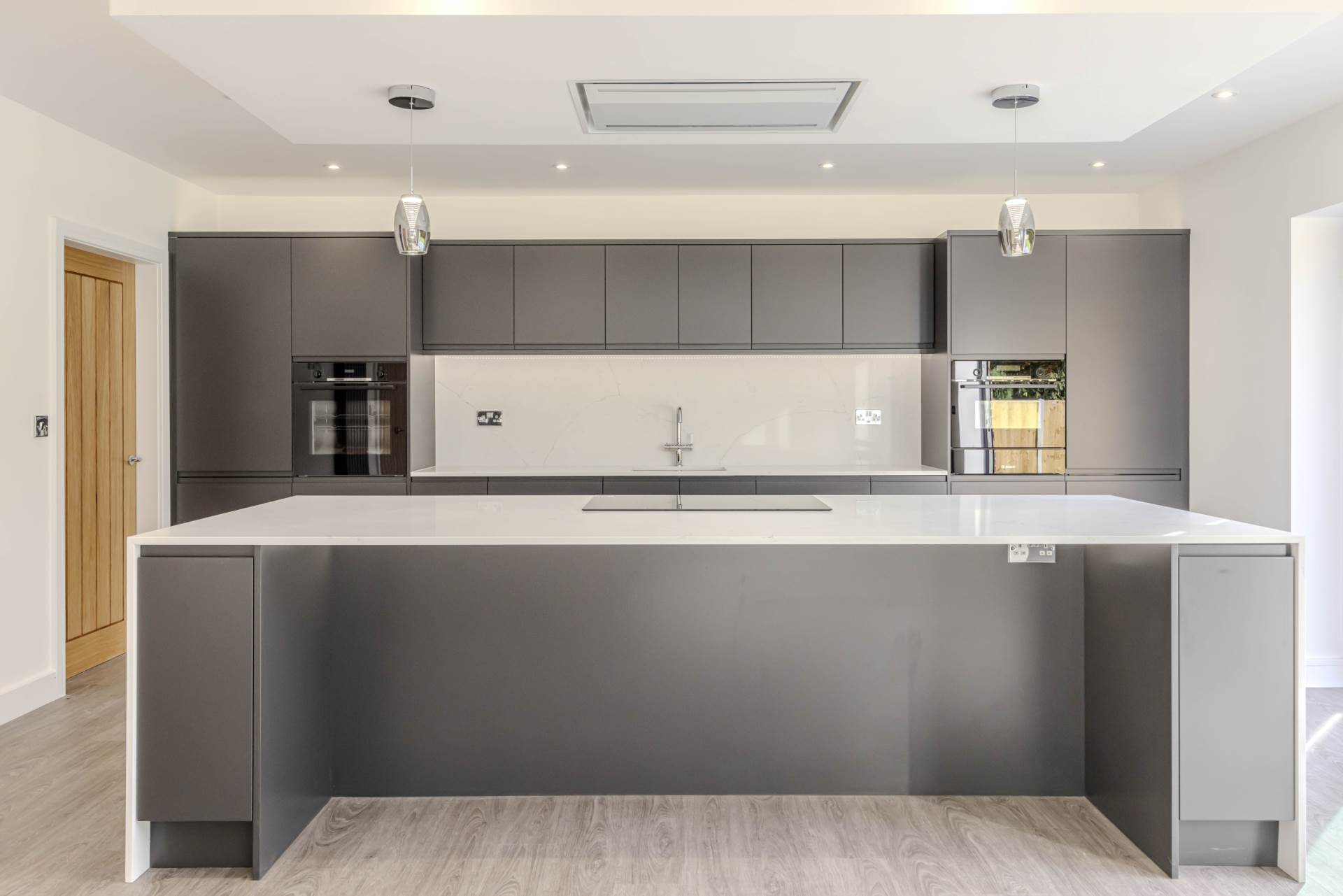 Contemporary, fully fitted kitchen with handle less doors in Matt Graphite