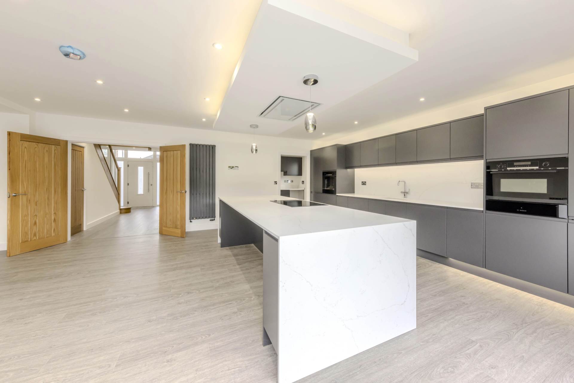 Island with Bosch 5 ring induction hob quartz worktop and waterfall edge