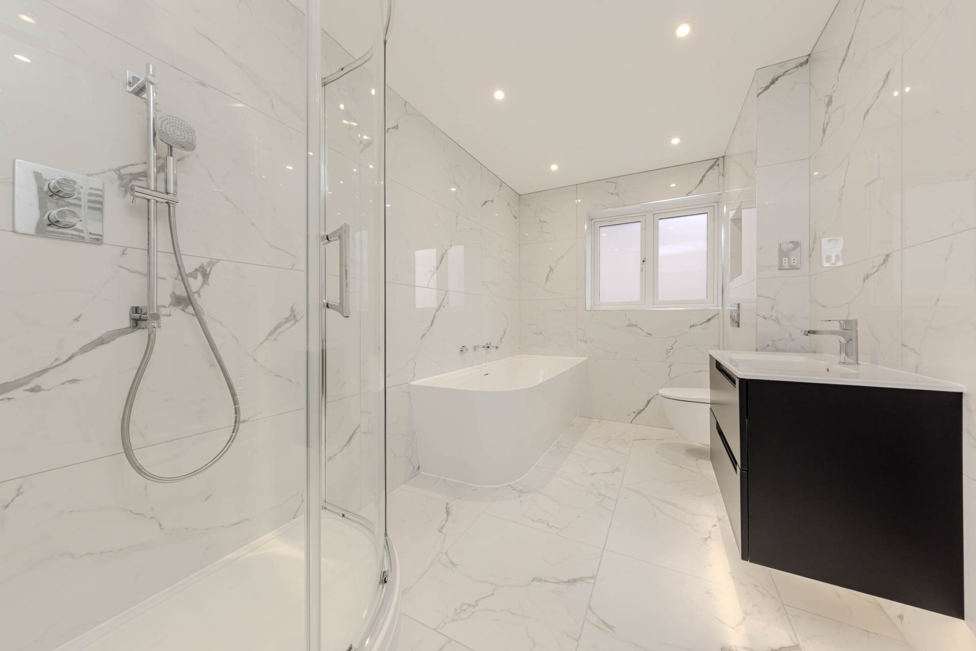 - Walk in shower with rainwater shower head and detachable showerhead