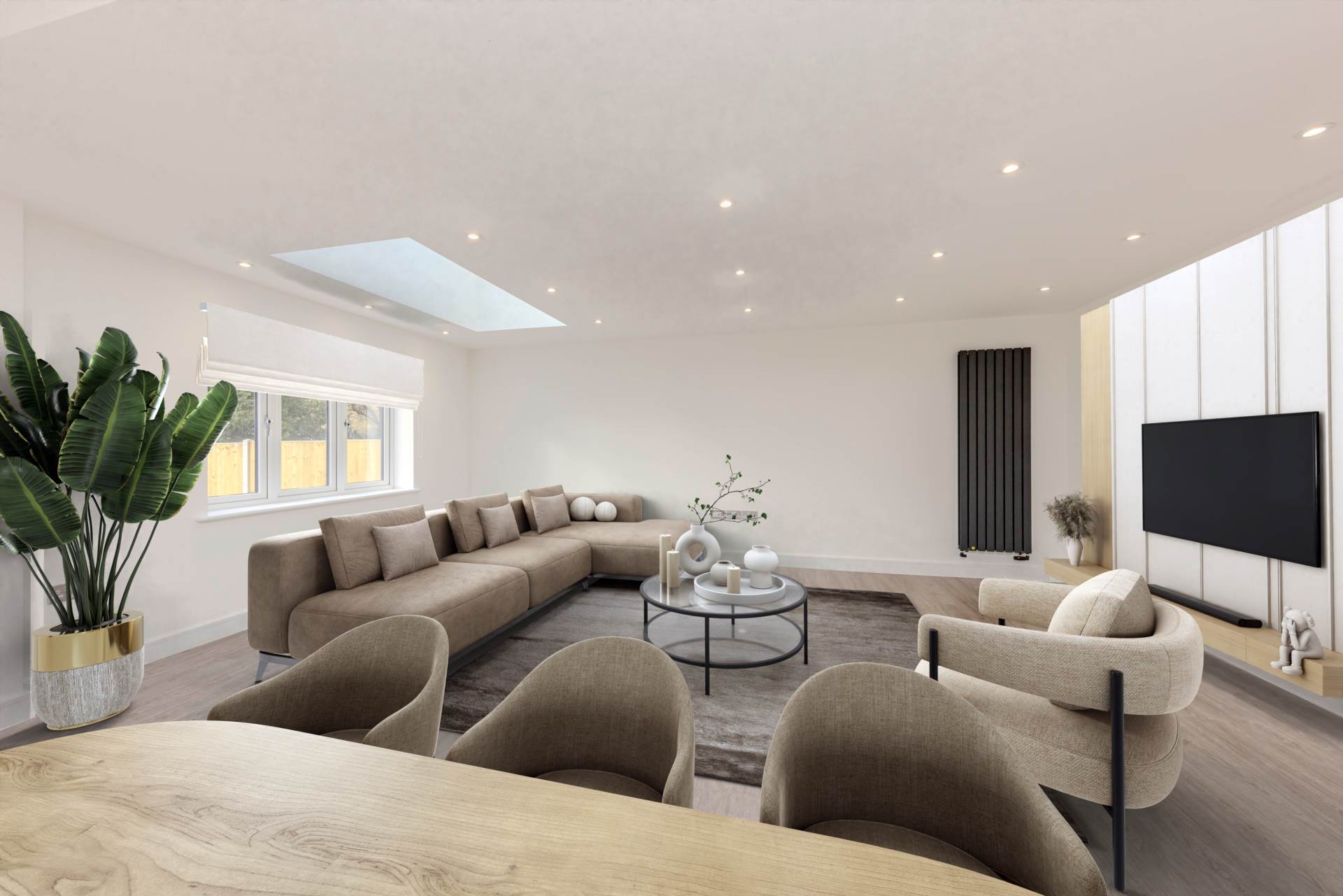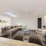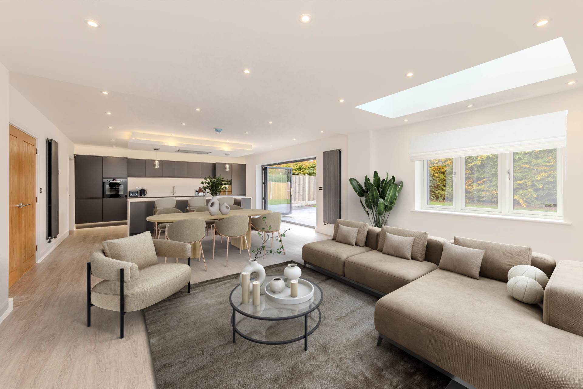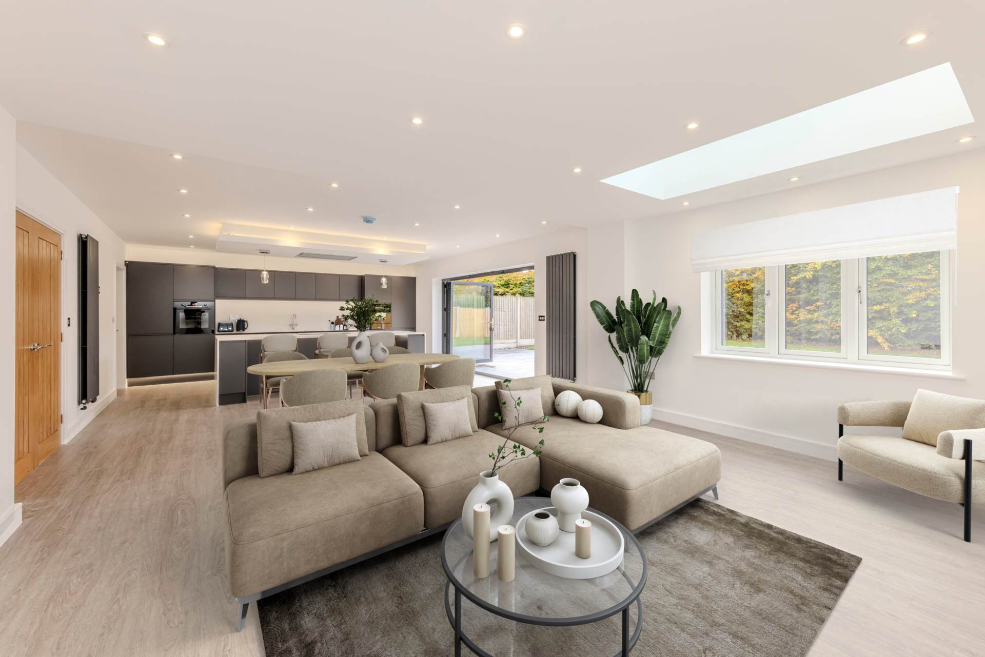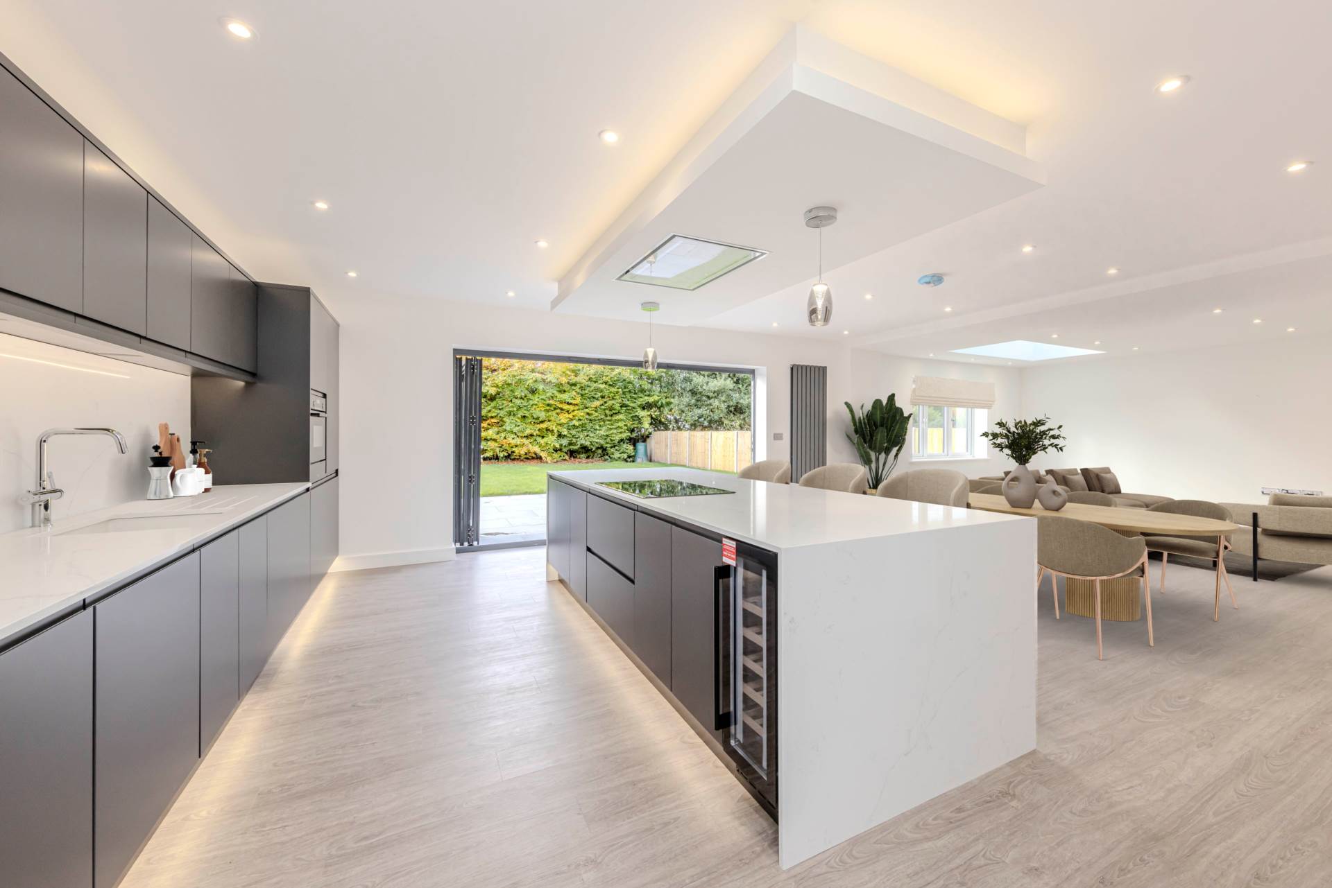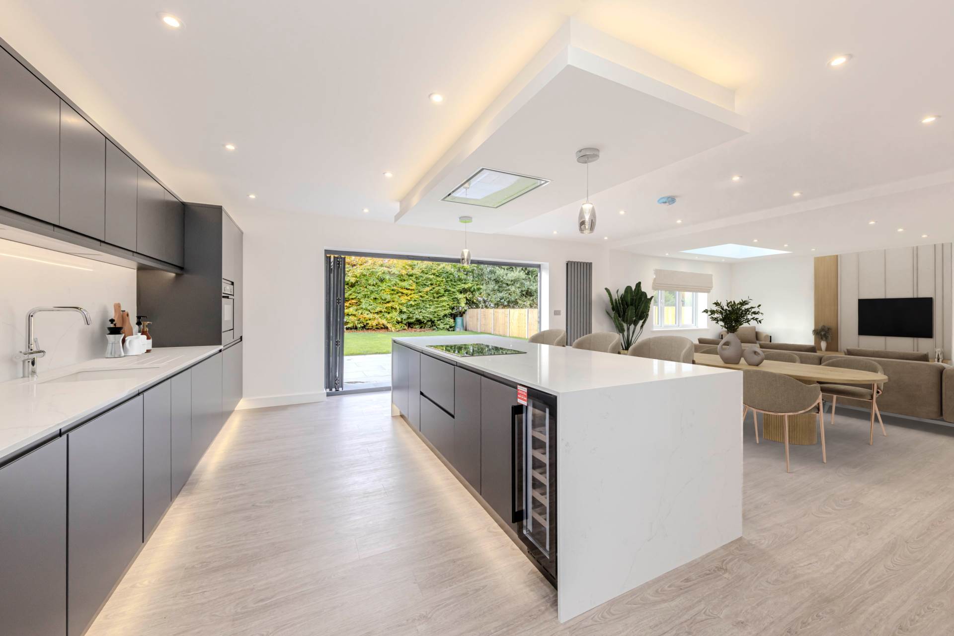 The open plan kitchen/dining room and family room is the heart of the home, with bi-fold doors leading out to a porcelain patio and large family garden, perfect for summer barbecues and outdoor activities.
