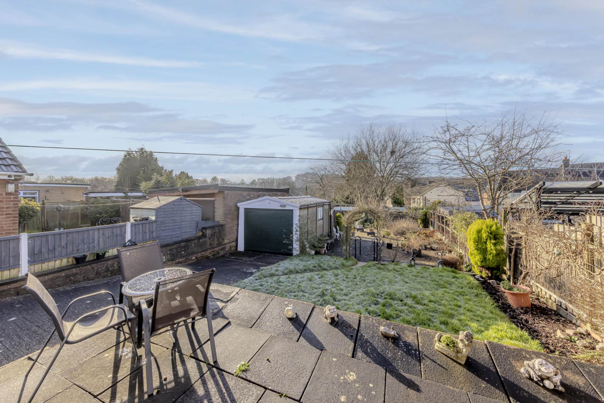 A detached garage provides secure parking or additional storage, complemented by a large driveway at the front, offering ample off-road parking for multiple vehicles. The exterior of the property is well-maintained, with mature shrubs and greenery enhancing the curb appeal.