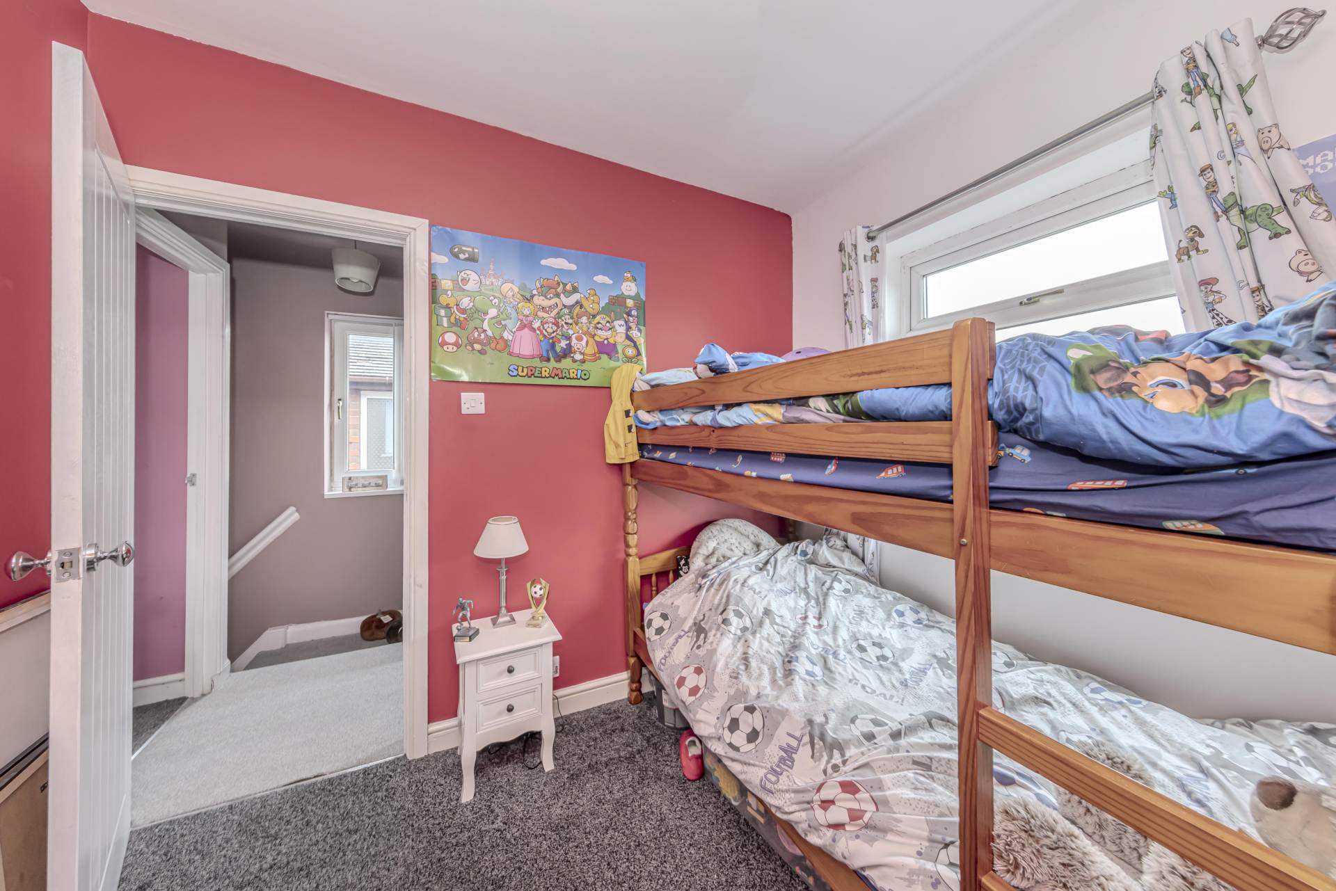 Upstairs, the property boasts two well-proportioned bedrooms, each offering plenty of space for rest and relaxation. Both rooms benefit from good natural light and neutral tones, providing a blank canvas for personal touches. The bathroom is conveniently located on the first floor and features a clean, contemporary design with a bath, shower, wash basin, and WC.